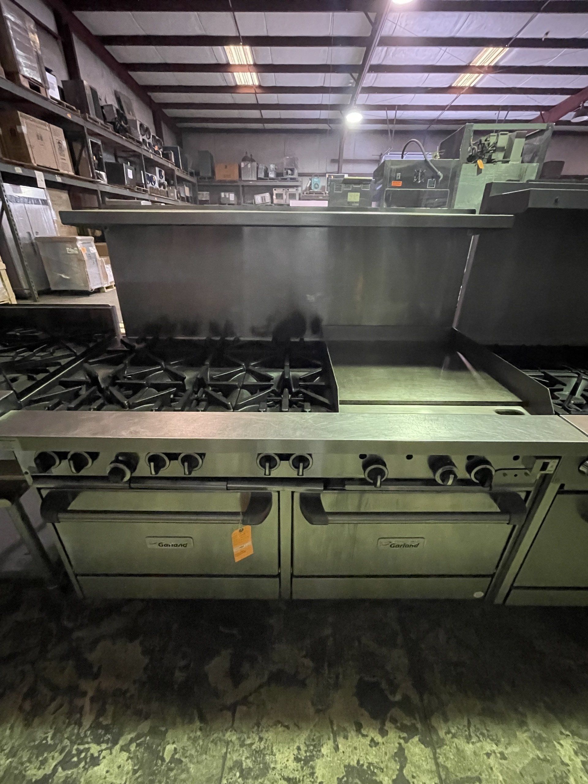 Sunfire® Restaurant Range, gas, 60", 24" griddle with 5/8" thick steel plate, (6) 30,000 BTU open burners, with cast iron top & ring grates, (1) standard oven, (1) Convection Oven, with 2 position rack guides with oven rack each, stainless steel front, sides, plate rail, backguard, & high shelf, 6" steel core legs, 286,000 BTU, NSF, CSA